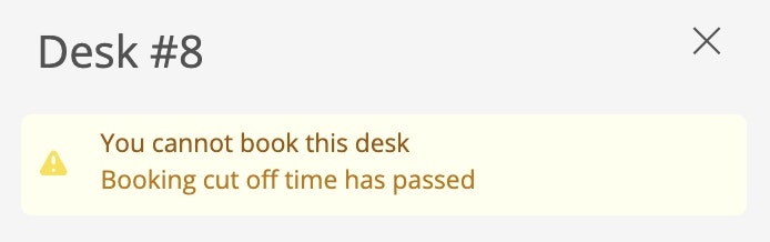Example: 3pm 1 day before: This means desk bookings must be placed before 3pm the day before.