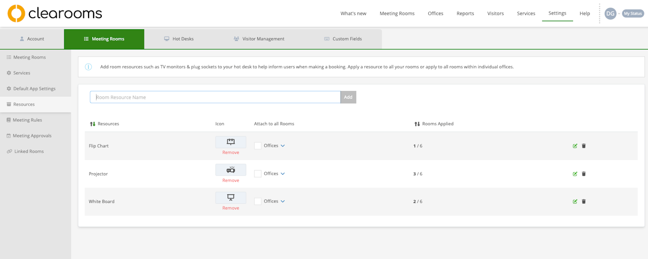 Let your users know the resources located in your meeting rooms by adding resource. Navigate to Settings < Meeting Rooms < Resources type the name of the resource in the box room Resource name and click add. Any resources will than show in the table below. Example of Room Resource could be: